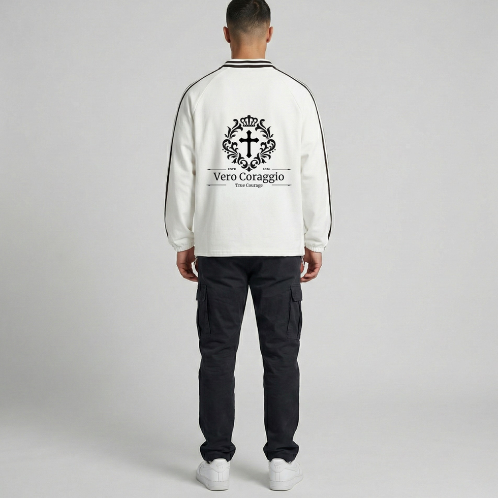 YESHUA stands at the intersection of intentionality and influence. The Vero Coraggio is not just an apparel choice; it is a statement of identity. By reimagining the traditional raglan sweatshirt through a high-fashion lens, our design team asserts that comfort should never come at the cost of command. The bold contrast striping on the lapel collar serves as a signature of authority, signaling a wearer who values both heritage and innovation.